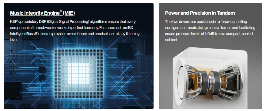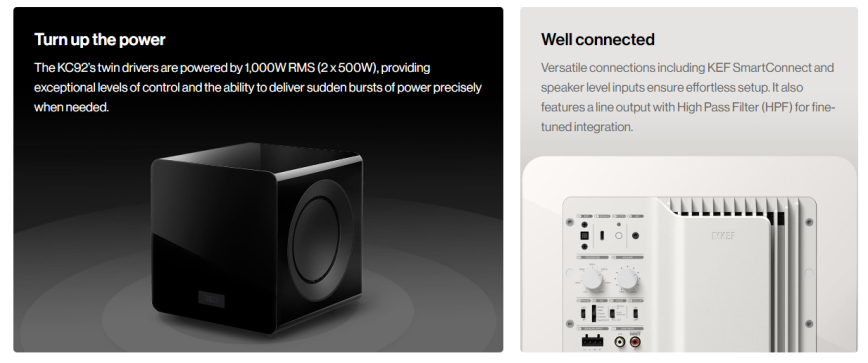 Kompakt men ändå robust, KC92-subwoofern har 2 x 9-tums force-cancelling drivrutiner som drivs av en formidabel 1000W (RMS) förstärkning. Optimerad med KEF:s Music Integrity Engine®, KC92 subwoofer levererar anmärkningsvärt djup och slagkraftig bas med exceptionell precision, vilket ger dig en uppslukande, ultradynamisk lyssningsupplevelse.