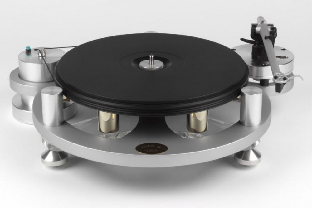 Massive acrylic/vinyl platter of high inertia, with gold-plated brass weights