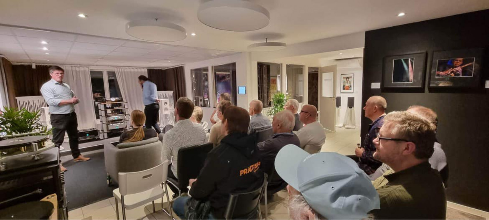 Vanligtvis så har vi leverantör på plats för ett visst fabrikat som under kvällen demonstrerar nyheter eller vi jämför olika utvalda produkter av ett sortiment, jämför skivspelare/ förstärkare etc.