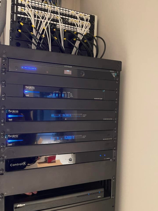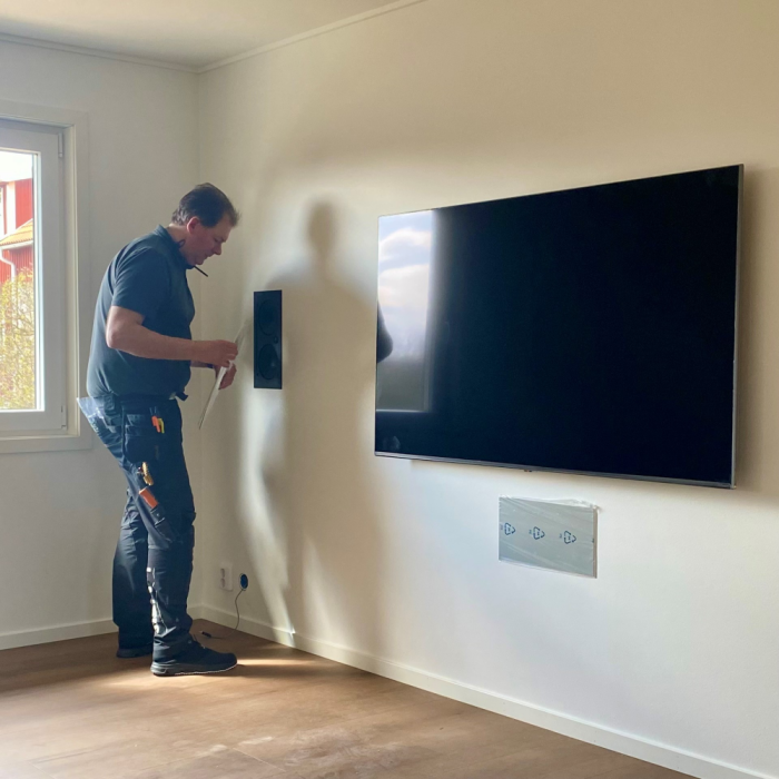 Vi börjar montera TV- apparater och deras installationslåda bakom tv'n, Monterar racket och programmerar. Först stommen, sen ljus, värme, ljud och bild och avslutningsvis mörkläggning.