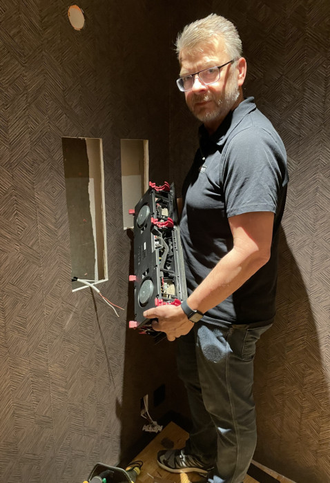 Racket bygger vi i första hand i våra lokaler så vi kan testa allt innan leverans. I detta skede monteras även inbyggda högtalare.